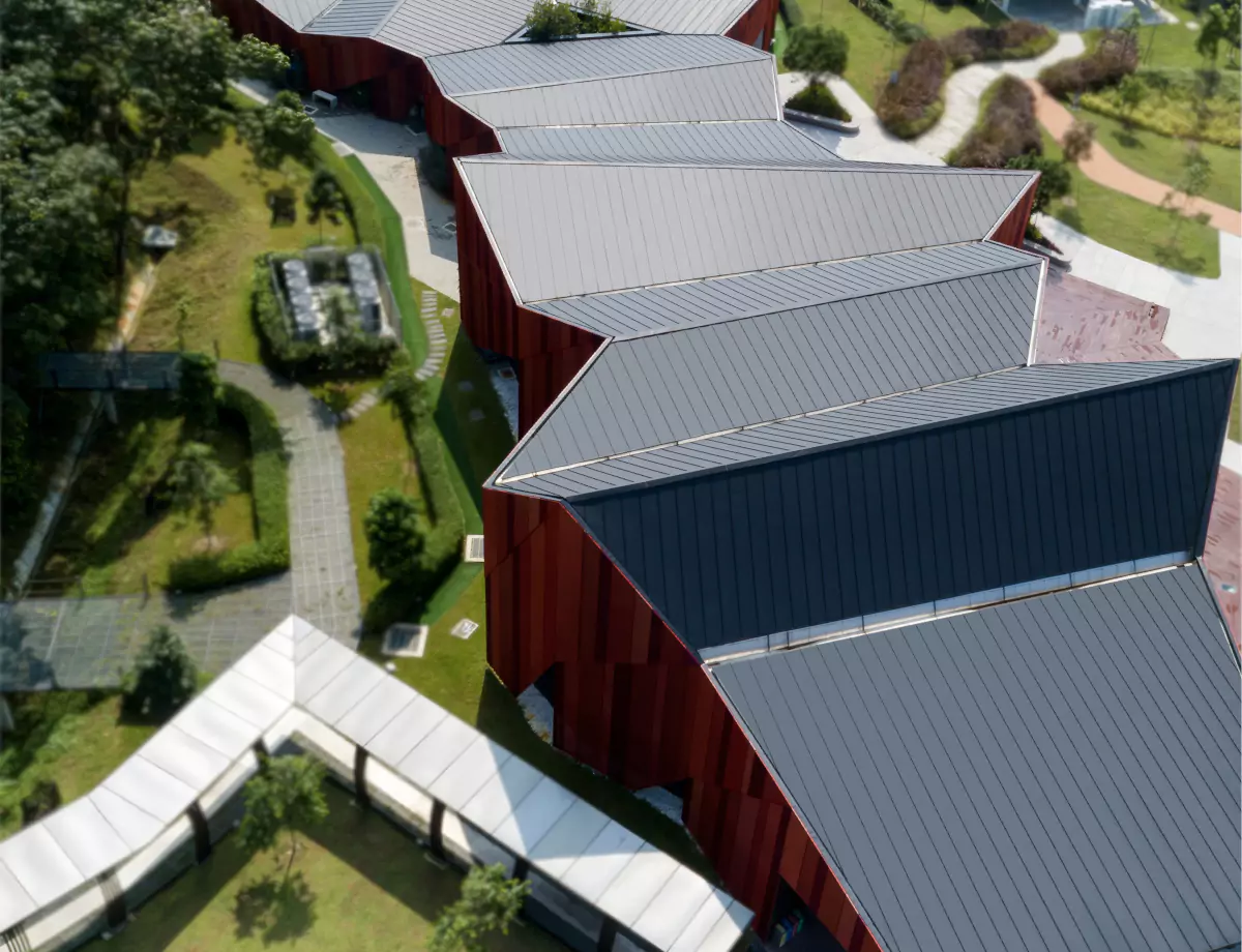 Crafted with Swissma Doppelwelt® Standing Seam roof, the undulating roofs ensure weathertightness and well-designed thermal and acoustic indoor comfort that supports the GBI Certification. The choice of VERMOE® Steel in dazzling Black with fine wrinkle finishing complements the striking red mesh wall and seamlessly blends with the surrounding forest, creating a harmonious effect that resonates with nature.